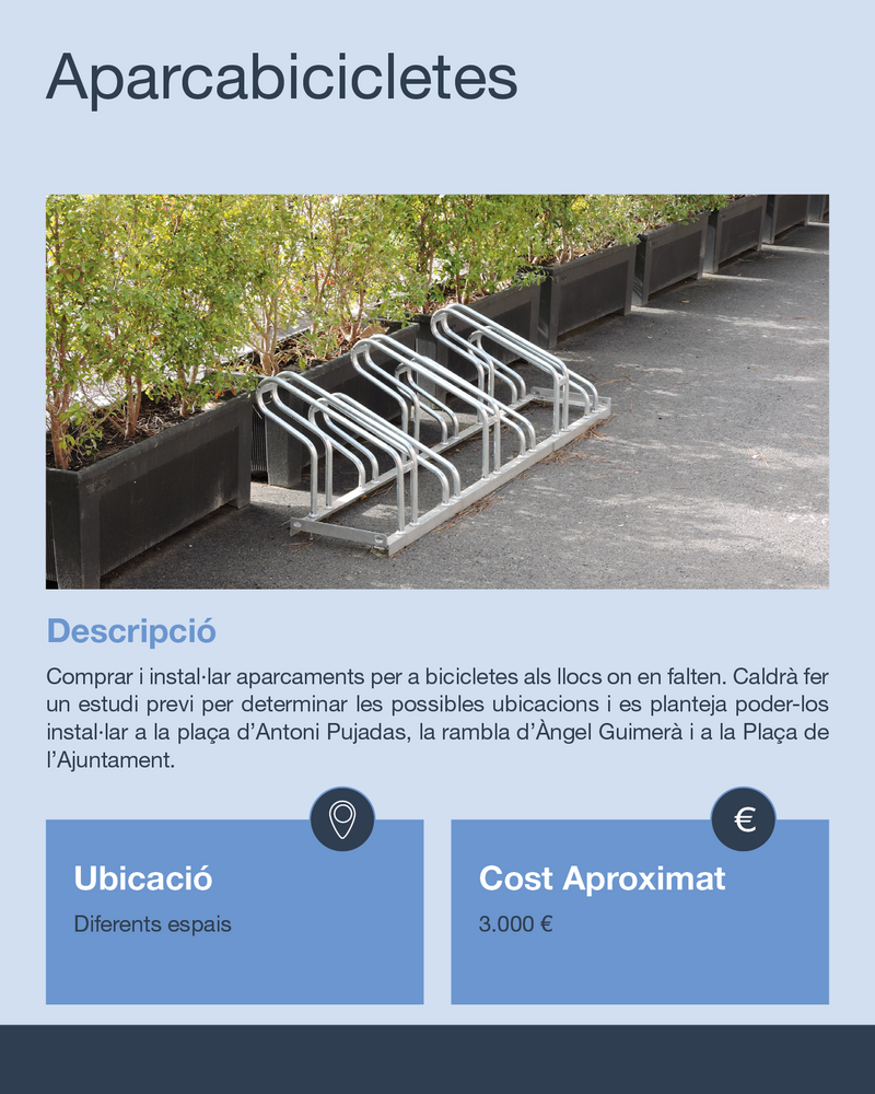 Descripció breu: Inversió per la compra i instal·lació d’aparcaments per a bicicletes als llocs on en falten. Es podria fer una anàlisi prèvia per a determinar les ubicacions. En tot cas, se’n troben a faltar a: la plaça Sant Antoni Pujades (davant Sorli), Àngel Guimerà (pels ciclistes que s’hi aturen a esmorzar) i a la plaça de l’Ajuntament.