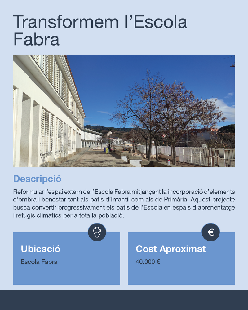 Reformular l’espai extern de l’Escola Fabra mitjançant la incorporació d’elements d’ombra i benestar tant als patis d'Infantil com als de Primària. Aquest projecte busca convertir progressivament els patis de l’Escola en espais d'aprenentatge i refugis climàtics per a tota la població, especialment per la comunitat educativa i l’alumnat de l’escola. L’objectiu és millorar la temperatura exterior i la sensació de benestar per tal que, en el futur, es puguin dur a terme activitats lectives a l’exterior sense haver de patir altes temperatures.