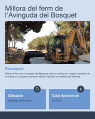 Descripció breu: Allisar el ferm de l’Avinguda del Bosquet, per no asfaltar-lo i seguir mantenint la muntanya i d’aquesta manera millorar i facilitar la mobilitat de vehicles. Necessitat que volem resoldre: