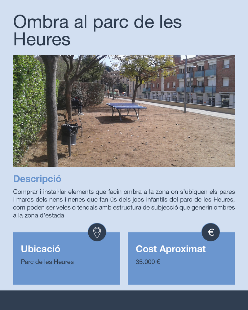 Descripció breu: Compra i instal·lació d’element per a fer ombra a la zona on s’ubiquen els pares i mares dels nens i nenes que fan ús dels jocs infantils ubicats al parc. Ex.- vela o tendal amb estructura de subjecció que generi ombra a la zona on els pares seuen.